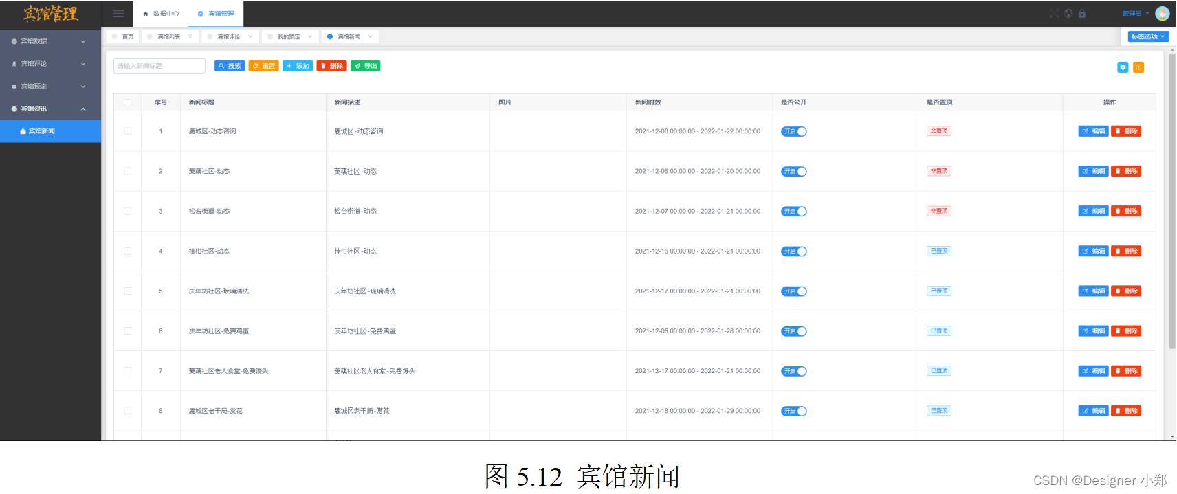 宾馆管理员可以根据自己的需求,发布关于宾馆的新闻信息,新闻资讯应包括了新闻图片、文字,管理员发布后,用户可以看到这些内容,系统同样采用了view ui的input组件,用于承载输入表单的数据。 宾馆管理员可以增删改查宾馆的资讯,如图5.12所示,更新完成后,用户就可以看到这些资讯信息。