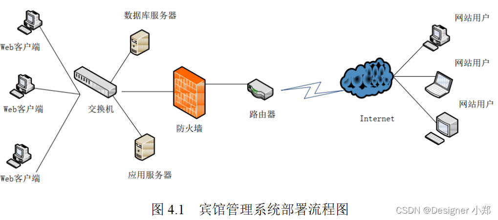 宾馆管理系统是面向全国高校使用的,所以需要开放外网端口,以便于宾馆工作人员使用。同时也要保留局域网部署的方式,防止外网被黑客攻击导致系统的瘫痪,保证宾馆的数据安全。宾馆管理系统的网络结构图如图4.1所示。