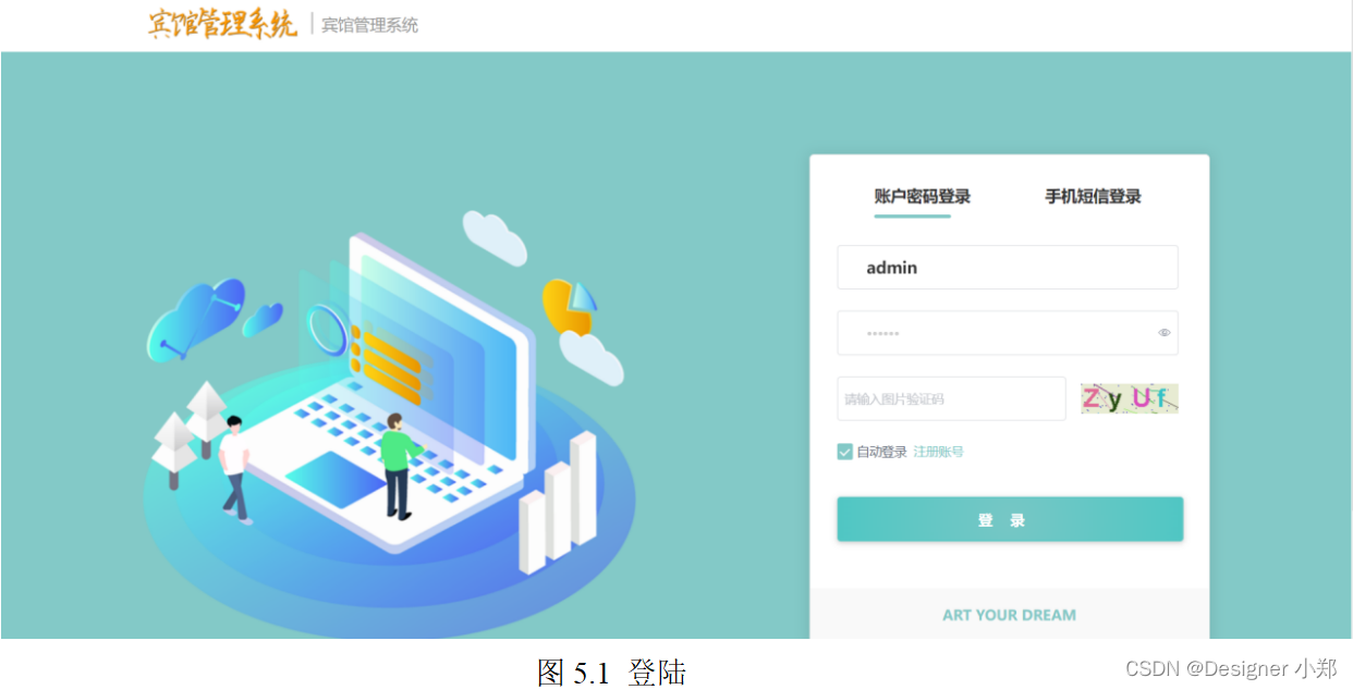 登录注册模块包括了基础的用户登录和用户注册功能,用户通过这个模块进行认证,从而进入到宾馆管理系统。 图5.1是宾馆管理系统的登陆界面,用户需要输入登录账号、密码和图形验证码进入系统。