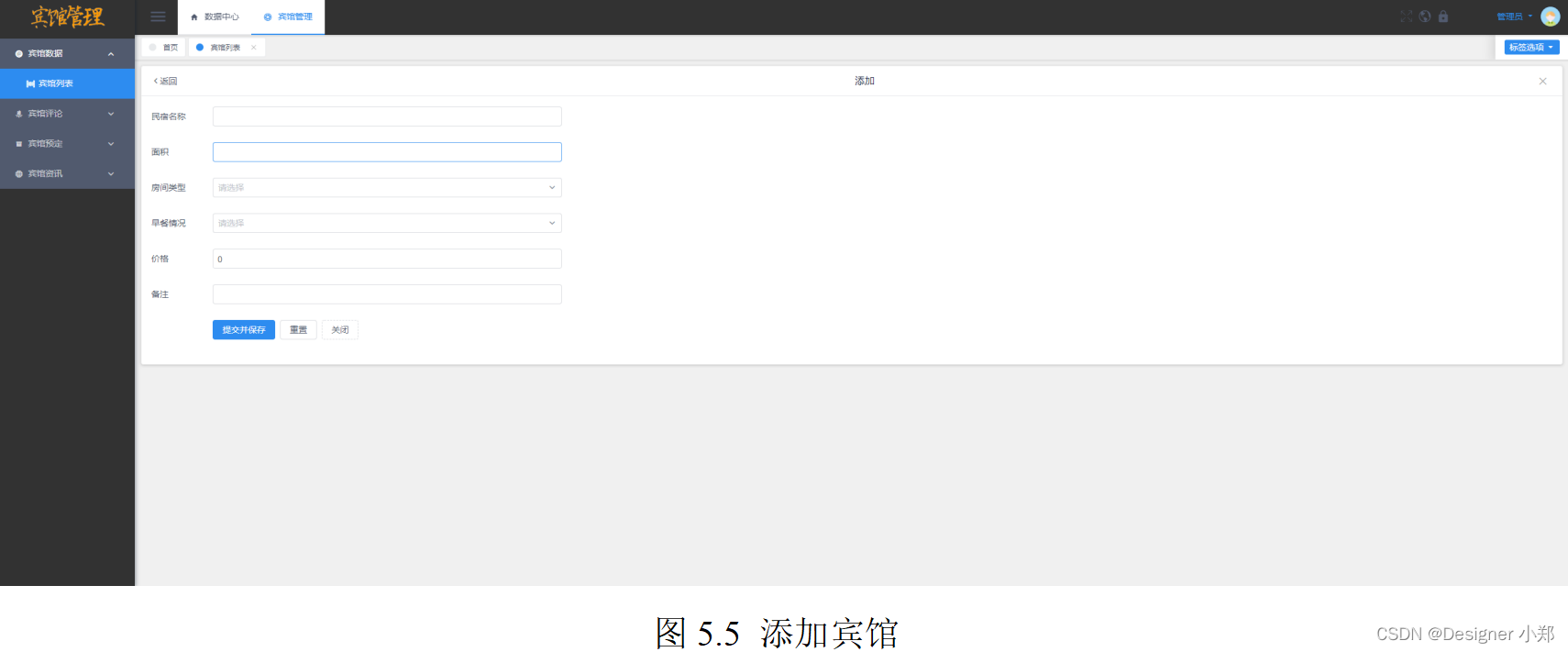 管理员可以点击添加按钮,进入宾馆添加界面,这个模块使用了view ui的input组件,用于存放相应字段,用户点击保存按钮后,系统将自动将表单数据提交给后端接口,后端保存到数据库,从而实现宾馆的新增,如图5.5所示。
