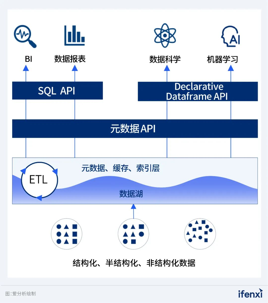 湖上建仓一定程度上实现了数据湖和数据仓库的结合。在这种架构中,多源异构数据先统一ETL至数据湖中进行集成、存储,再被ETL到数据仓库中,支持数据分析;同时也支持数据科学、数据挖掘、机器学习、深度学习等多种计算分析引擎访问。