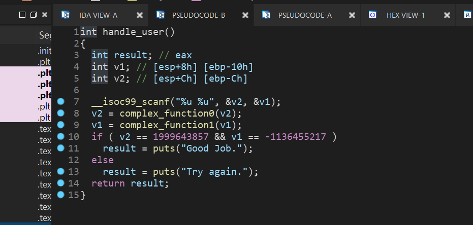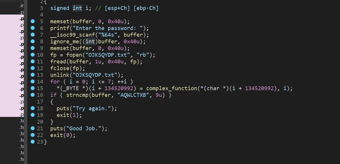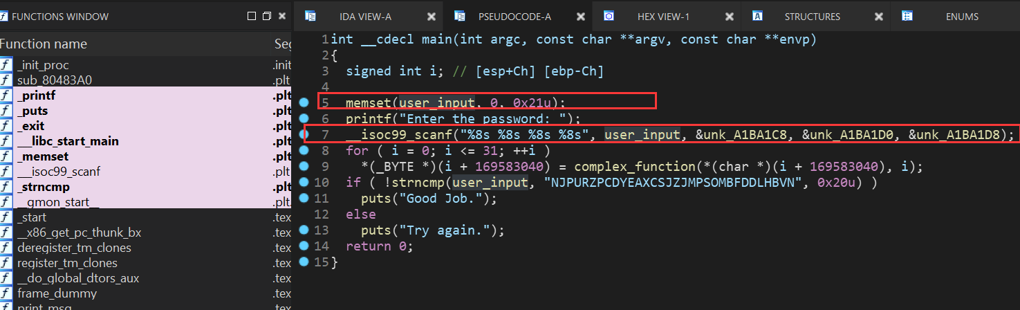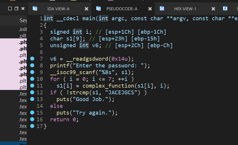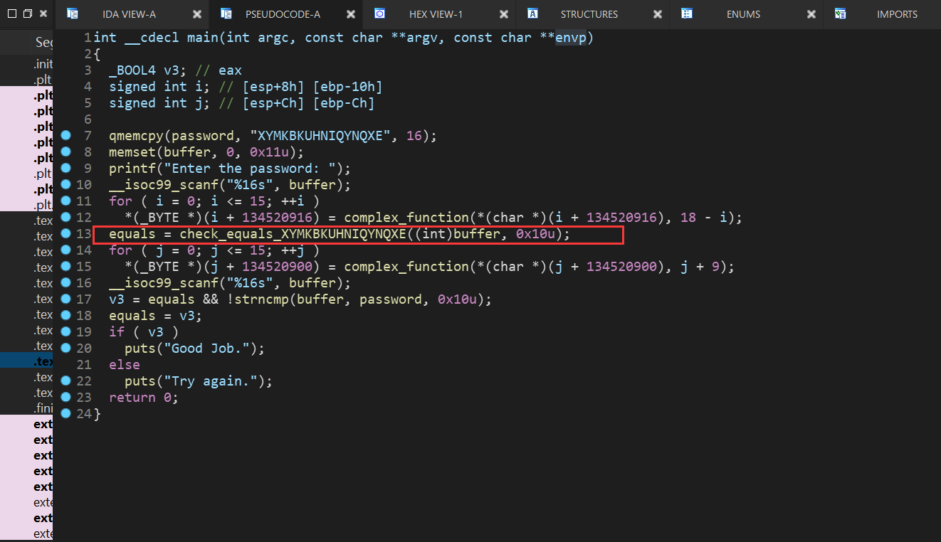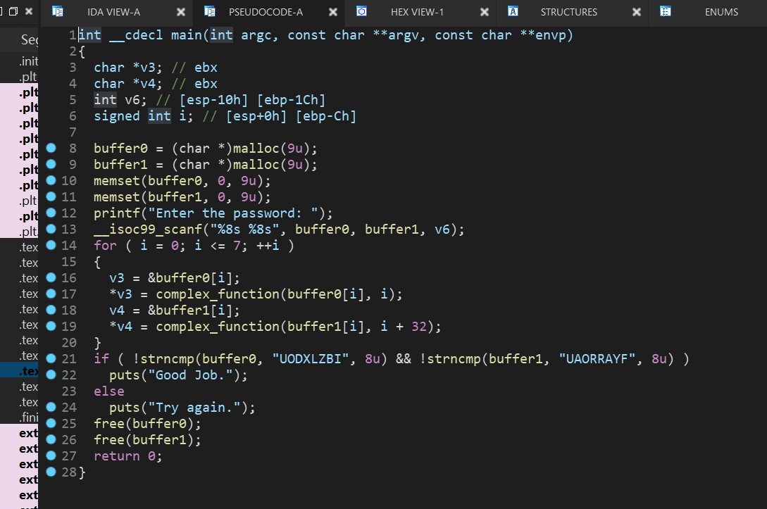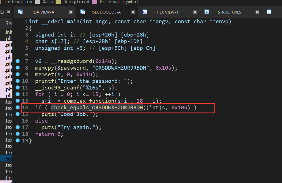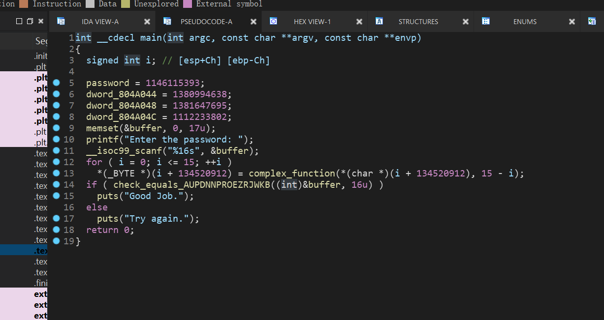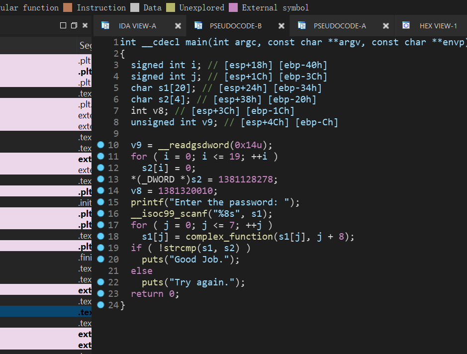 由于一些原因F5反编译main函数有点麻烦,修改IDA设置可以解决,但是本题影响不大