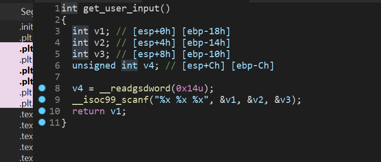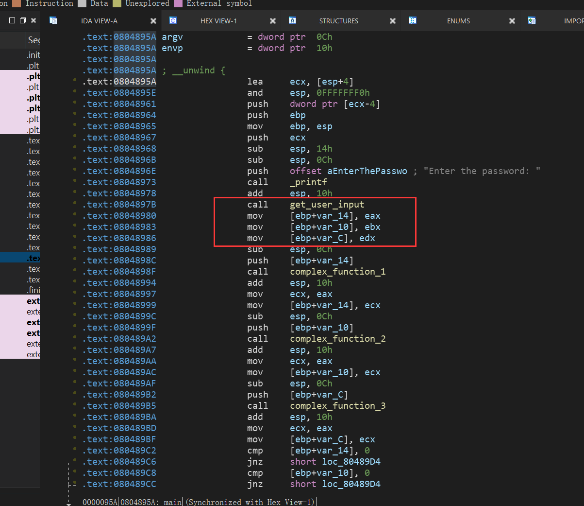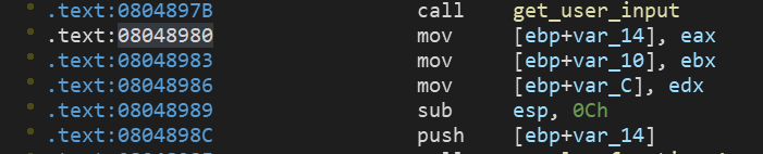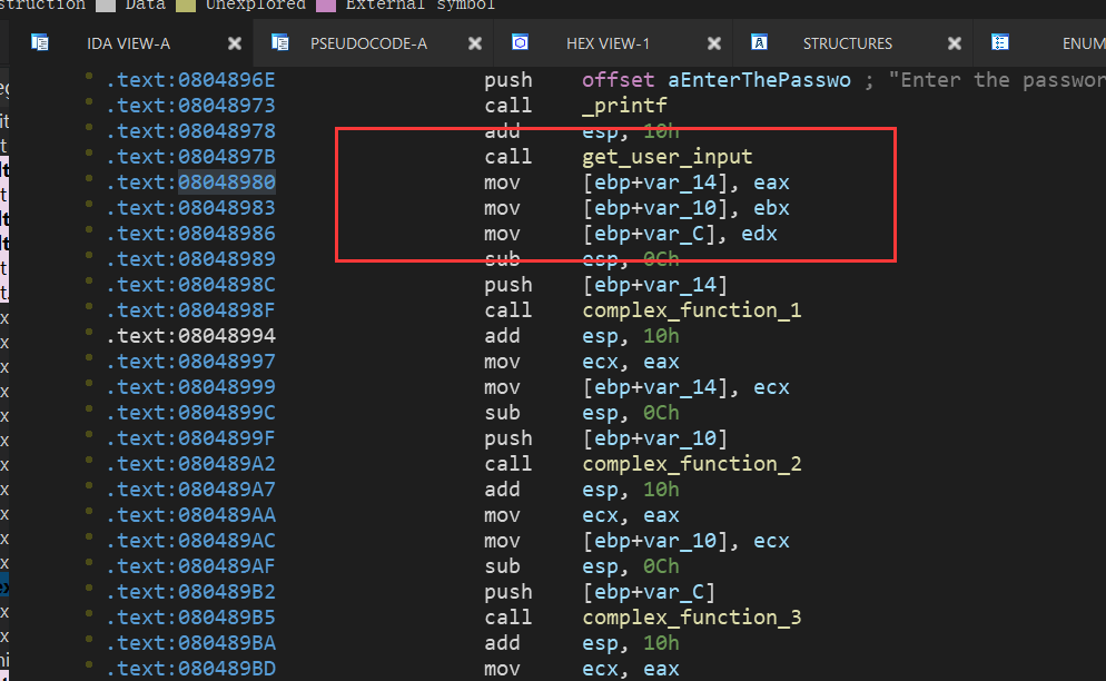 从这里可以看出,读入的三个值最终会分别存入eax和ebx和edx中,angr可以随意指定一个地址来往下进行运行,所以我们可以指定开始地址为:0x08048980