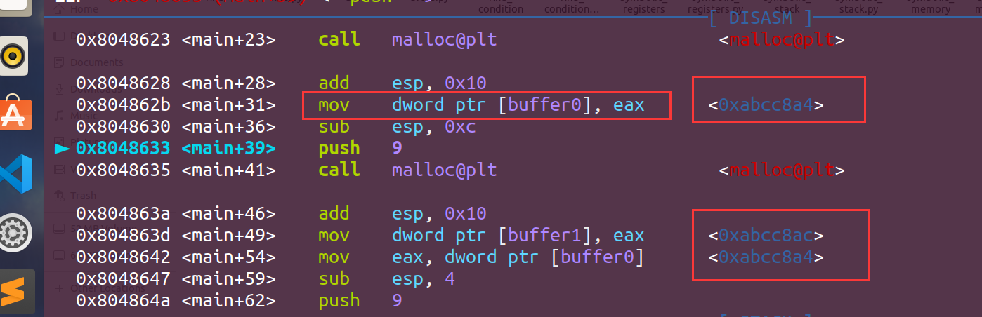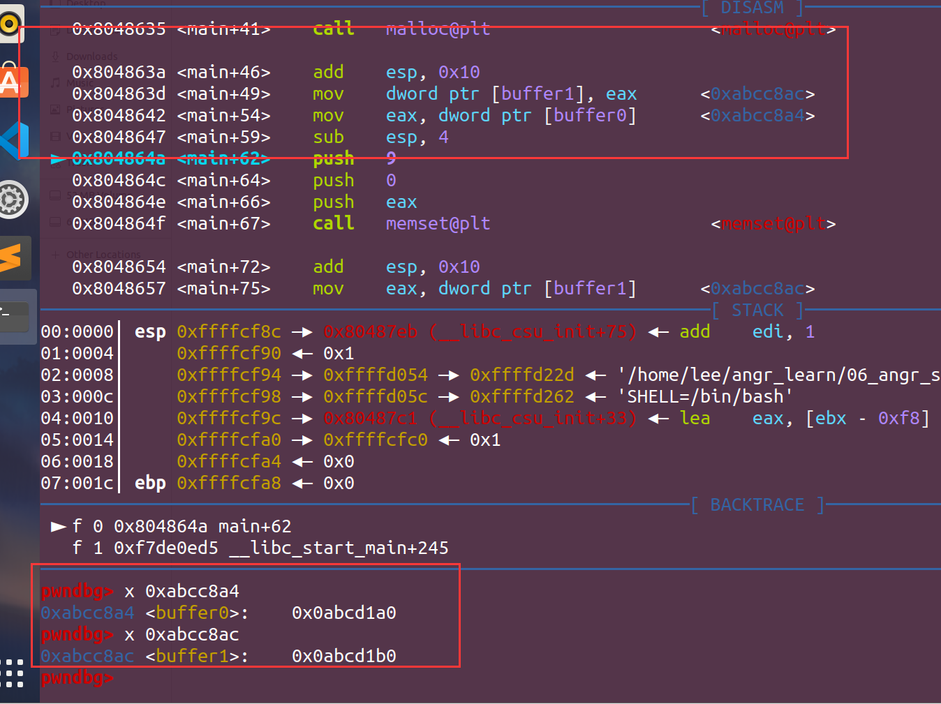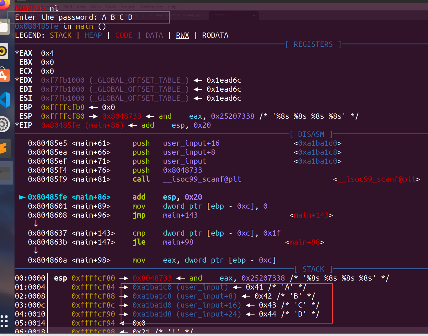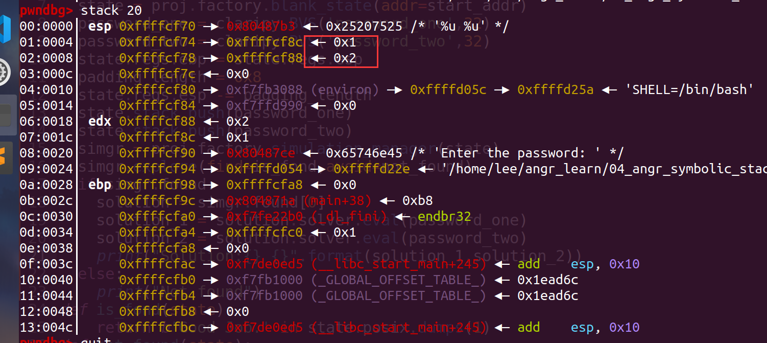 所以我们需要运行到angr中的对栈中的数据进行复制,这就要涉及到ebp和esp,然后还有距离,这里可以在gdb中调试来直观的计算距离: