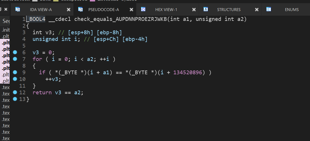 但是通过反汇编出来的代码我们可以大概知道比较的流程是如何,因为函数名也给出了提示信息,所以我们需要人为的添加一些限制条件,使遍历不那么盲目