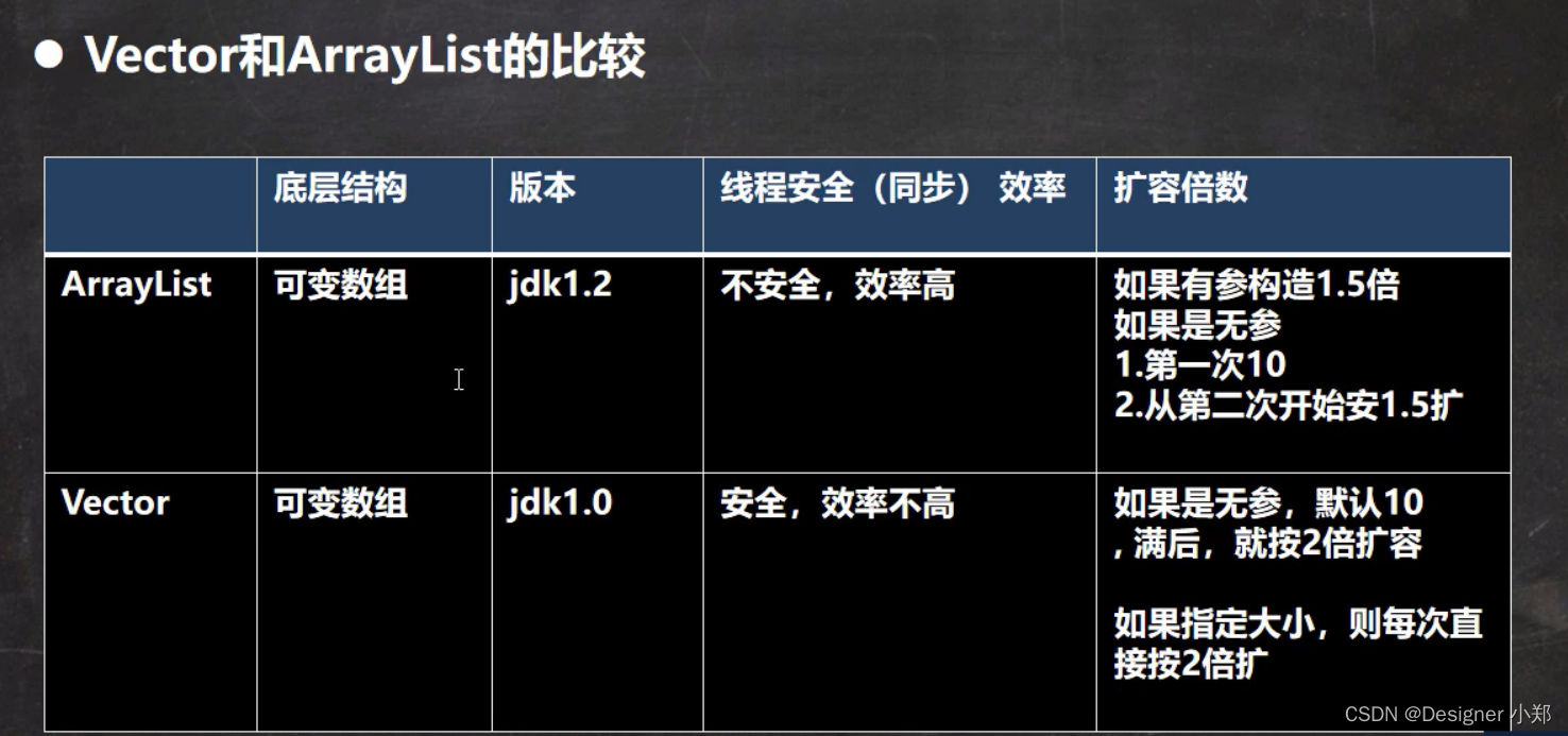 与 ArrayList 类似,Vector 内部也使用了动态数组来存储元素。当元素数量超过当前容量时,Vector 会自动增加容量。Vector 还提供了一系列方法来操作和管理元素,包括添加、删除、获取和修改元素的方法,以及支持枚举和迭代器等遍历元素的方式。