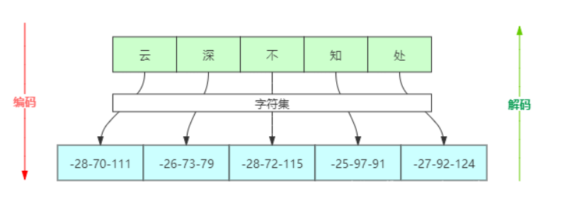 而在 UTF-8 编码中,一个中文字符是 3 个字节。例如下面图中,“云深不知处” 5 个中文对应的是 15 个字节:-28-70-111-26-73-79-28-72-115-25-97-91-27-92-124