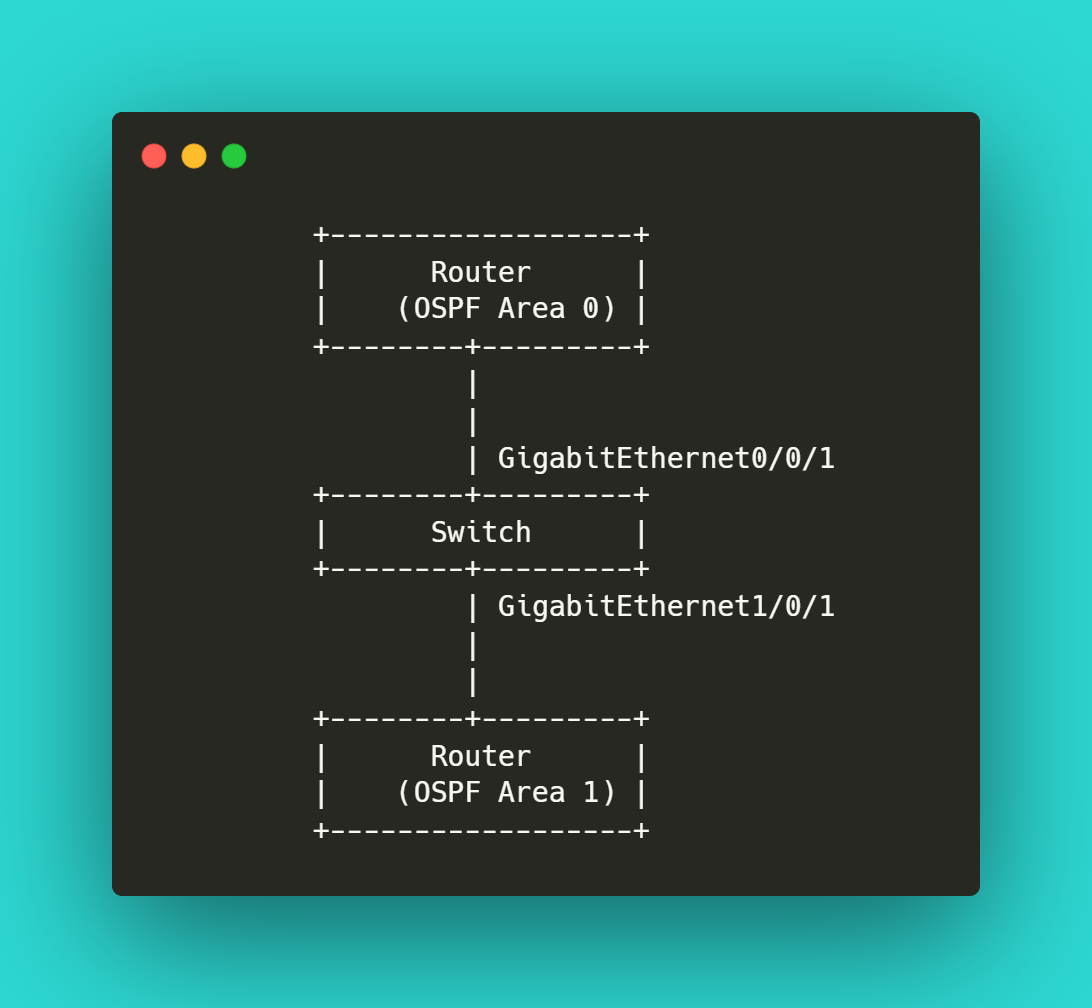 在这个简易的拓扑图中,有两台路由器和一台交换机。两台路由器分别位于不同的OSPF区域(Area 0和Area 1)。它们之间通过交换机连接。连接路由器和交换机的接口名称分别为GigabitEthernet0/0/1和GigabitEthernet1/0/1。