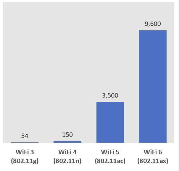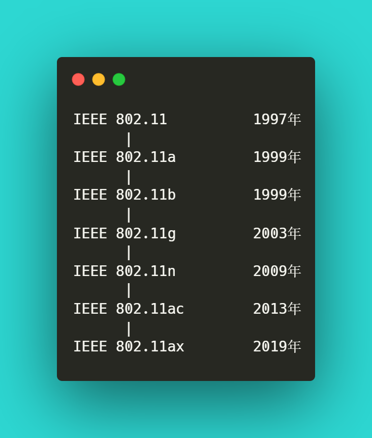 IEEE 802.11ax | 2019年 | 2.4GHz和5GHz | 9.6 Gbps | 支持MU-MIMO | 20/40/80/160 MHz | OFDMA技术,BSS色彩技术,TWT技术 |