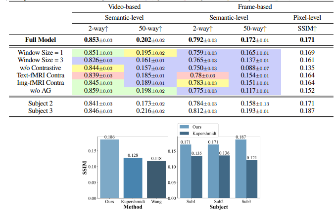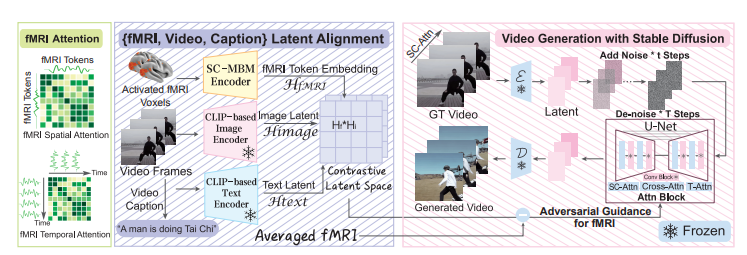 fMRI编码器在大规模数据集上训练,然后在目标数据集上通过对比学习进行微调,而基于Stable Diffusion的视频生成模块使用文本条件从目标数据集中的视频进行训练。