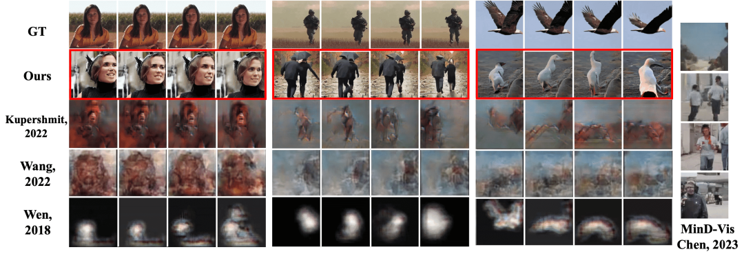 尽管fMRI的时间分辨率较低,但它包含足够的信息来恢复上述语义,下图显示了使用我们的方法重建帧的几个示例。