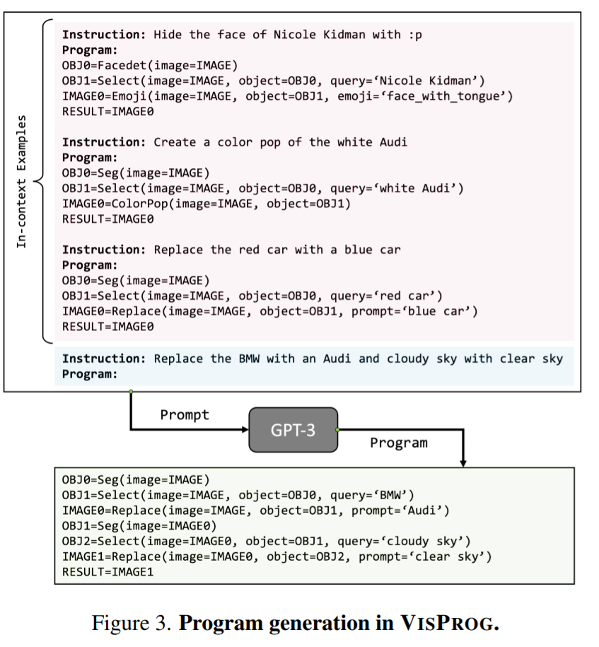 如下图所示,在不观察图像及其内容的情况下,VISPROG 生成一个程序(图 3 底部),可以在输入图像上执行所述任务。