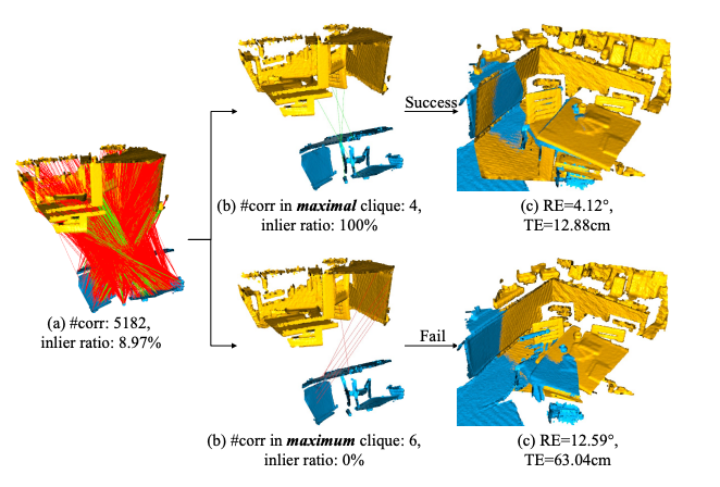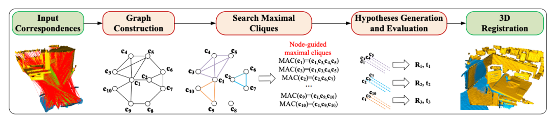该研究提出了一种基于最大团(maximal cliques,MAC)的 3D 配准方法。关键创新是放宽了对先前最大团的约束,并在图中挖掘更多的局部一致性信息,以生成准确的位姿假设。
