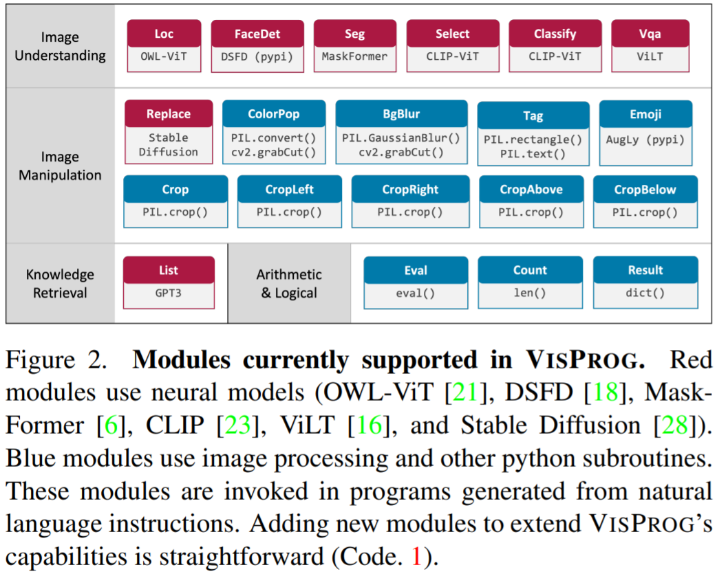 VISPROG 目前支持 20 个模块(见图 2),用于实现图像理解、图像操作(包括生成)、知识检索以及执行算术和逻辑操作等功能。