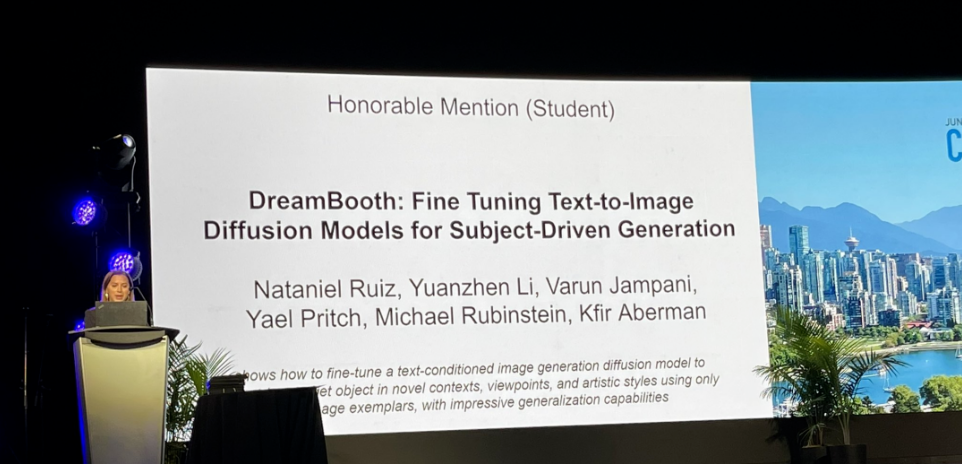 今年的最佳学生论文提名颁给了谷歌和波士顿大学的 Dreambooth。该技术在 AI 画图领域里已经很有名气,户只需提供 3~5 个样本加一句话,AI 算法就能定制照片级图像。