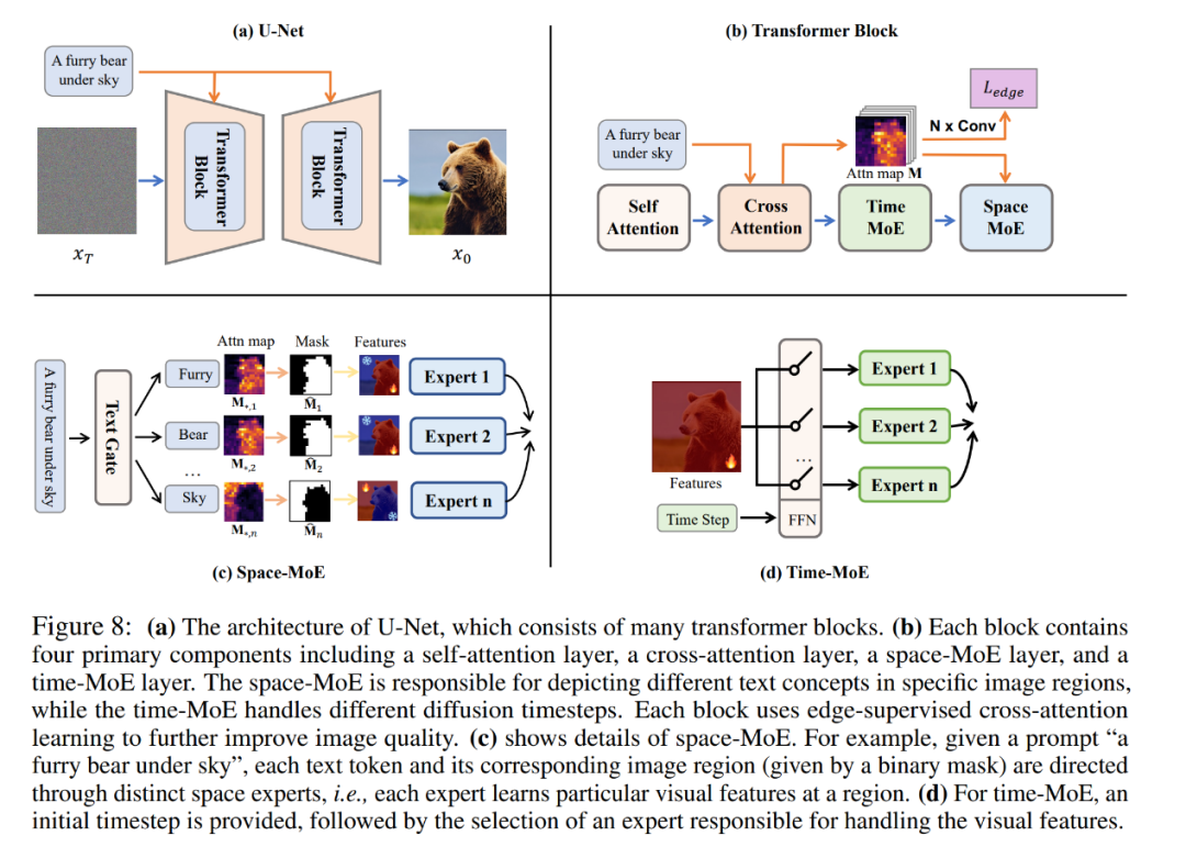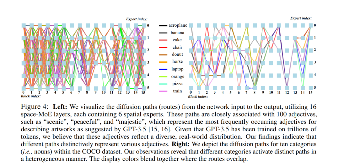 Time-MoE 模块使得模型能够在不同的 timestep 上选择不同的 expert;这些 MoE 事实上组成了一系列的 diffusion path,用来画某一类名词,动词,或者形容词。这些词的 diffusion path 都可以被 XGBoost 算法分开,证明了每一个 path 负责一个词。如下图所示: