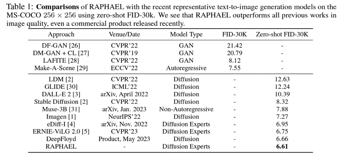 该研究首先在 FID 上进行了测试,FID 是一个衡量图片生成质量和多样性的指标,常常被用于评测生成模型的能力,实验在这一指标上击败了如 Stable Diffusion,DALL-E 2 等模型,达到 6.61。