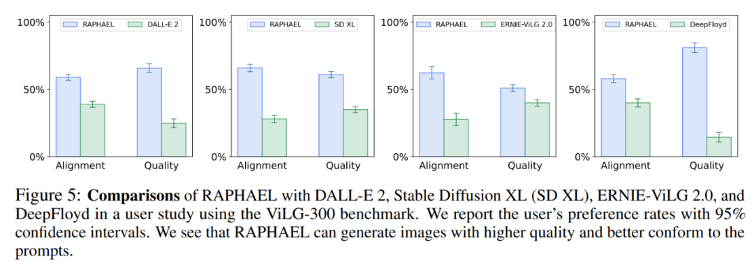 此外,研究者同时也基于人类评估给出了一些指标,结论发现 RAPHAEL 在图文匹配度以及生成质量上均超过了 Stable Diffusion XL,DeepFloyd,文心一格以及 DALL-E 2,如下图所示: