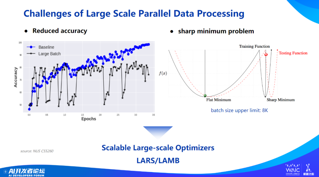 但是,大模型时代面临的问题是循环次数逐渐减少情况下,收敛变得越来越困难 —— 假如之前用 1 万次循环做收敛,batch size 增加 10 倍就需要在 1000 次循环中完成收敛。所以,数据并行的难度在于它的 accuracy 有时候会掉很多。因此需要看能不能设计出更好的优化方法,去解决这个问题。