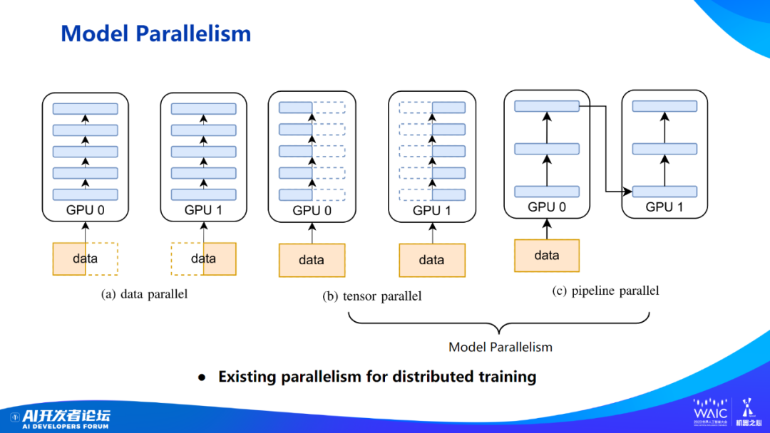 目前,训练 AI 大模型的并行系统主要有三个。最开始也是黄仁勋在 GTC 中介绍的,包括数据并行、模型并行和流水线并行。