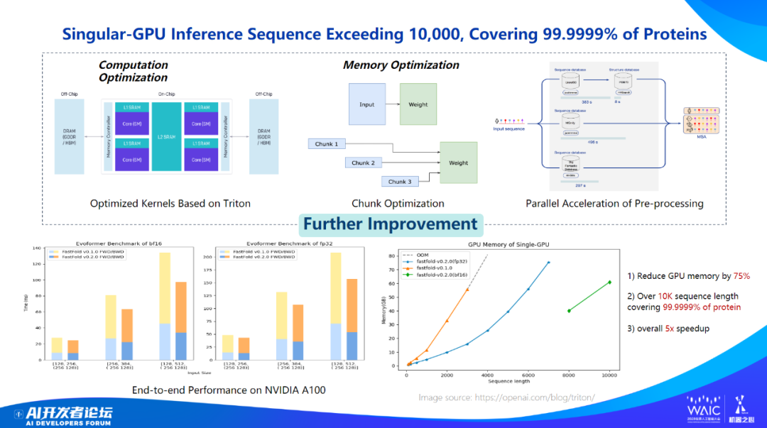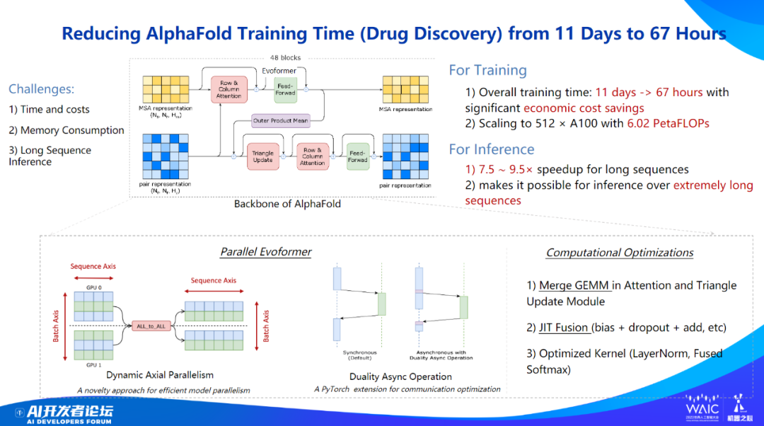 当然,由于我们做的是计算优化,因此不会限制于某个特定行业或者模型,具备良好的通用性。例如对于生物医药行业的蛋白质预测模型 AlphaFold2,我们也可以优化提升约 10 倍的训练推理速度。