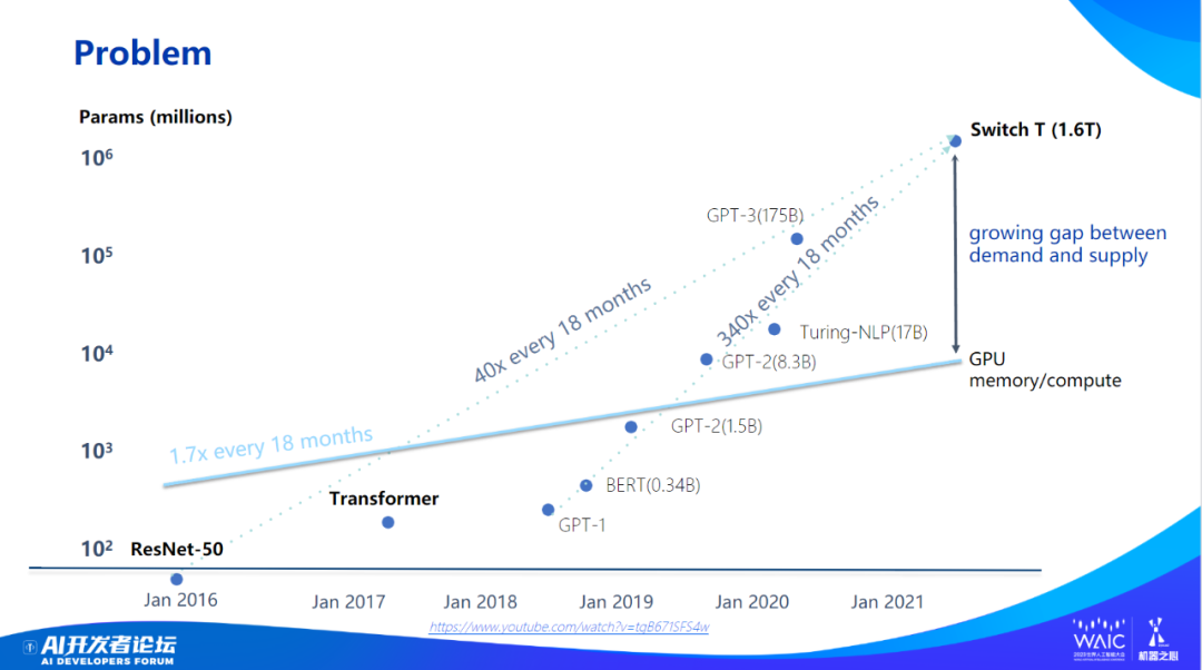 但是,以 GPT-3 为例,模型构造没有到 100 层,ResNet-50 也是 50 层左右,层数基本上没变化,模型不是变得更深而是变得更宽,大了 1-10 万倍左右,也给 GPU 内存造成更大压力,但 GPU 内存每 18 月只增长 1.7 倍,这就需要对下一代人工智能基础设施进行优化或者重建。