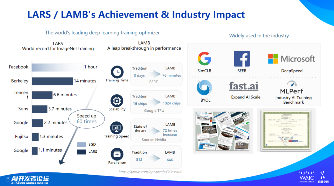 包括谷歌,Facebook SEER,Deepmind BYOL 等使用了 LARS 和 LAMB 方法。我们也帮助谷歌把 BERT 训练时间从三天缩减到 76 分钟。