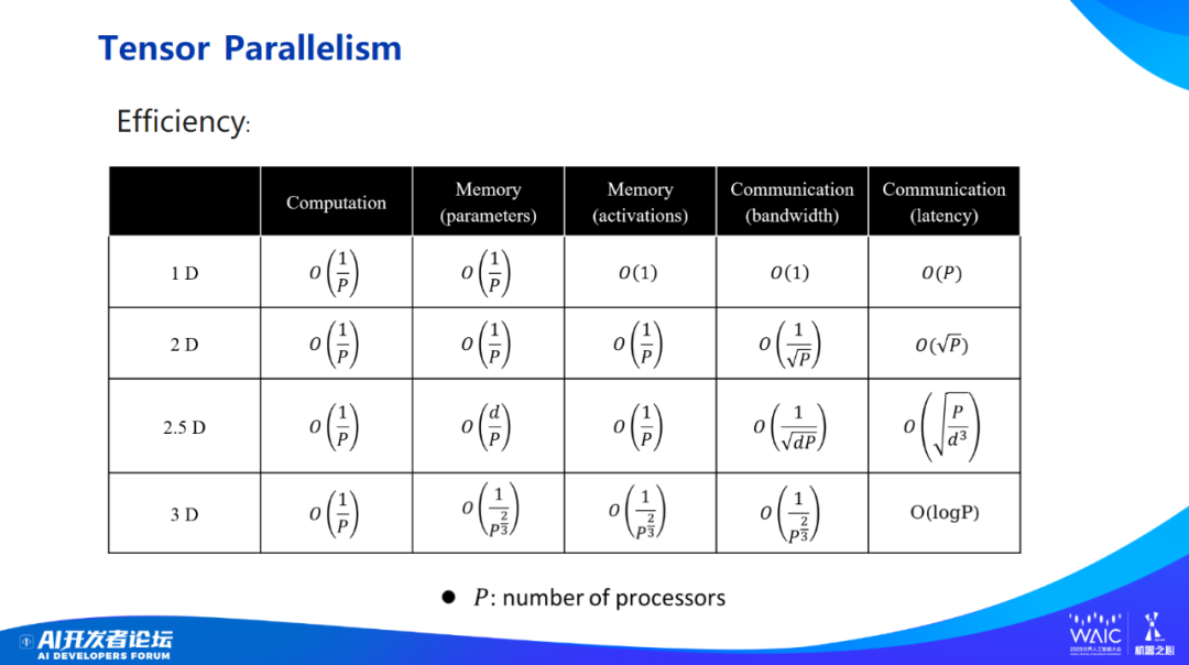 这几种张量并行方式的训练效率差异非常大,特别是二维和三维张量并行。可以看一下最后两列(最右侧两列):第一个是通信带宽上的代价,第二个是通信延迟的代价。二维、三维、2.5 维张量并行可以大幅度降低通信和内存开销。