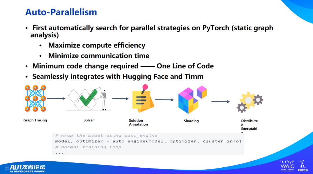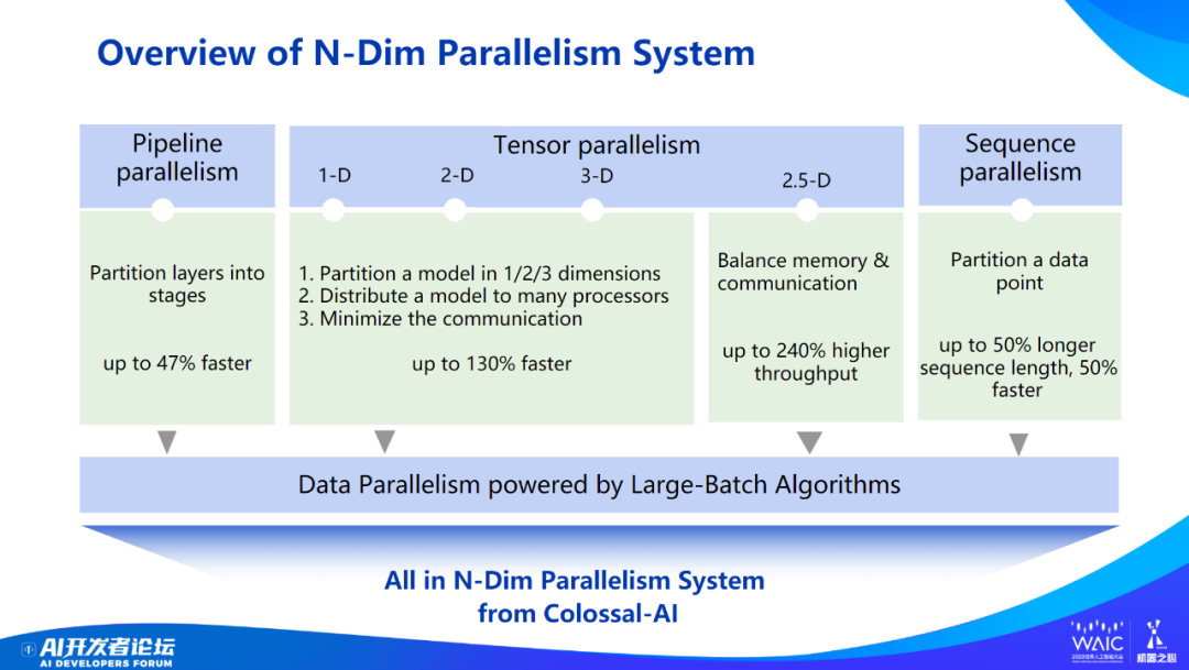 第二部分是 N-Dim 并行技术(N 维并行技术)。据说 OpenAI 已经用 10 万张 GPU 卡训练大模型。前两天一家美国创业公司融资了 13 亿美金,背后基础设施据说已经有 2 万张 GPU 卡。未来,从 1 个 GPU 到 10、100、10000 个 GPU ,自动扩展效率会对训练系统产生根本性影响,所以我们打造了 N 维并行系统。