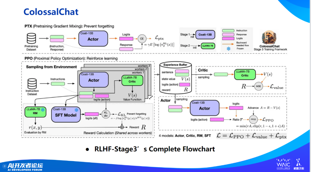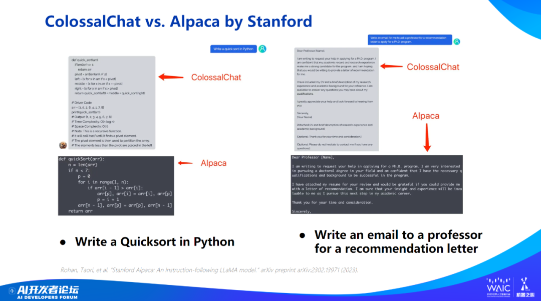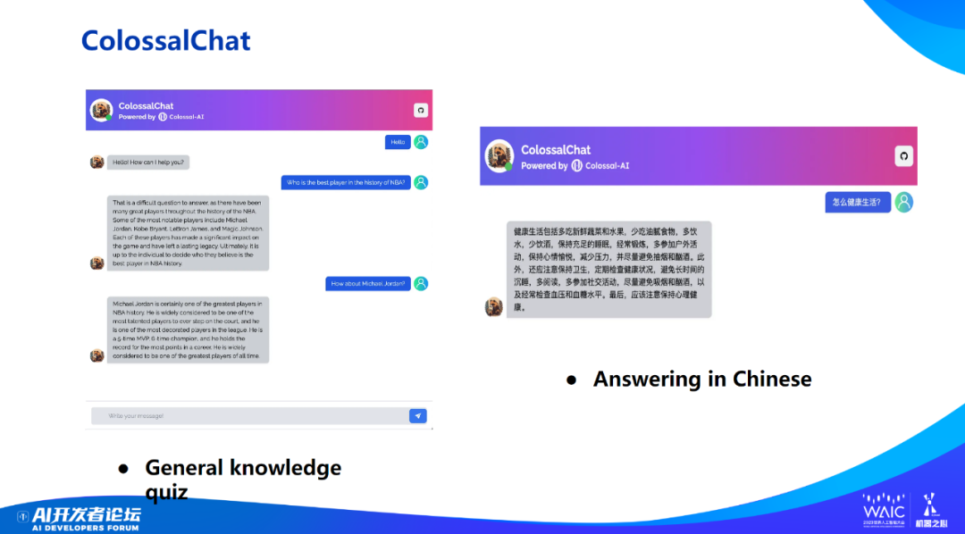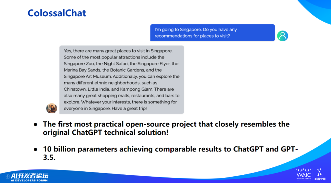 我们通过 Colossal-AI 做了 ColossalChat,是世界上首个开源的最接近 ChatGPT 原始技术方案,具备完整 RLHF 流程的低成本 ChatGPT 复现方案。只有 70 亿或 100 亿的参数模型可以达到更好效果。