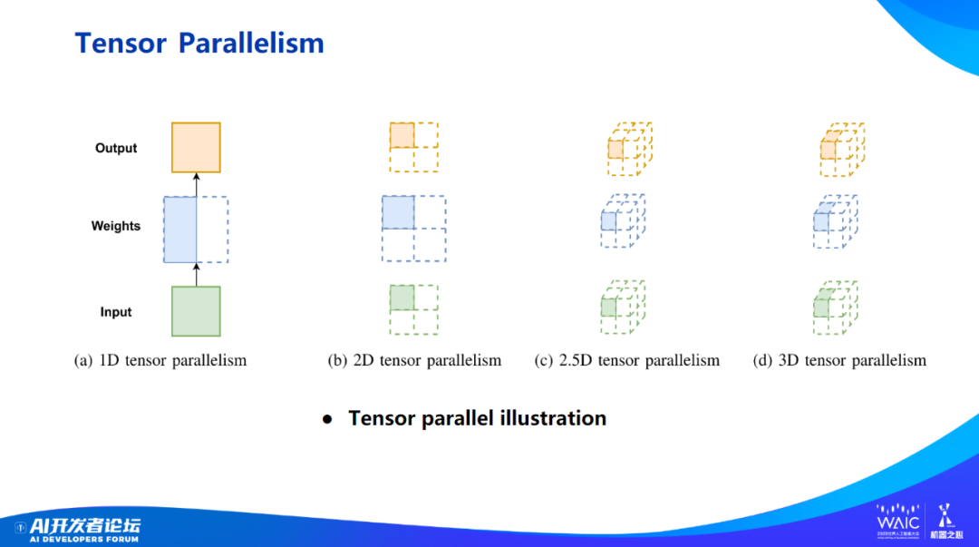 当然,张量并行最大的弊端是它的通信开销太大,这也是黄仁勋在 2021 年演讲里提到把所有张量并行都放在服务器内的原因,跨服务器的通信开销太大,得不偿失。所以,如何优化张量并行的通信就非常重要。我们又打造了二维张量并行、三维张量并行、2.5 倍张量并行,去最小化数据移动。