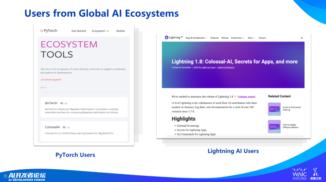 目前世界公认的第一大 AI 生态是 PyTorch ,它的生态图中有一个链接指向了 Colossal-AI。Lightning AI 是 PyTorch 第一大子生态,直接依赖于 Colossal-AI。