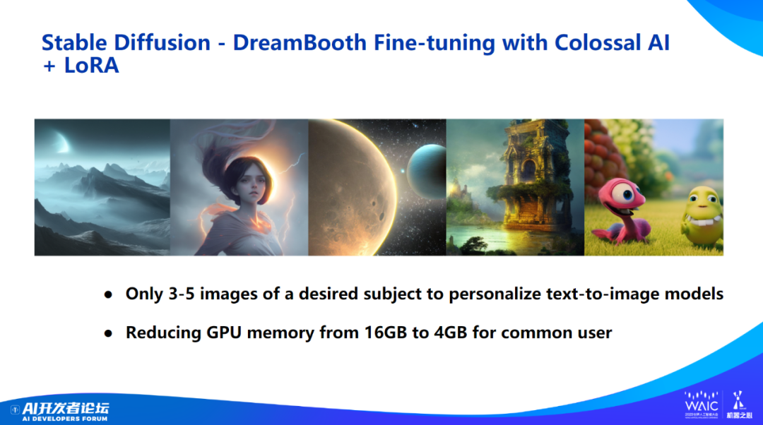 快速过一下一些应用效果。在一些重要应用比如 Stable diffusion 上,Colossal-AI 取得了很好的加速。我们可以把内存开销降低 5.6 倍,硬件成本降低 46 倍。Colossal-AI 经过了很多业界检验。