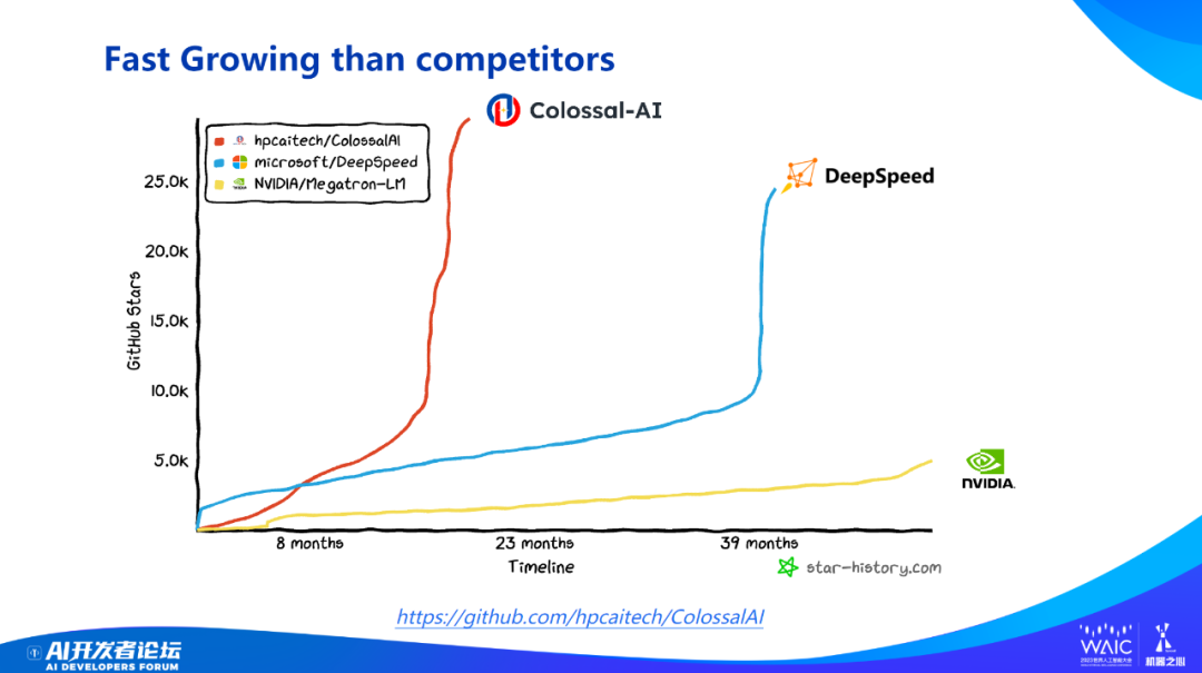 Colossal-AI 增速也远超与 Colossal-AI 类似软件,比如 DeepSpeed。