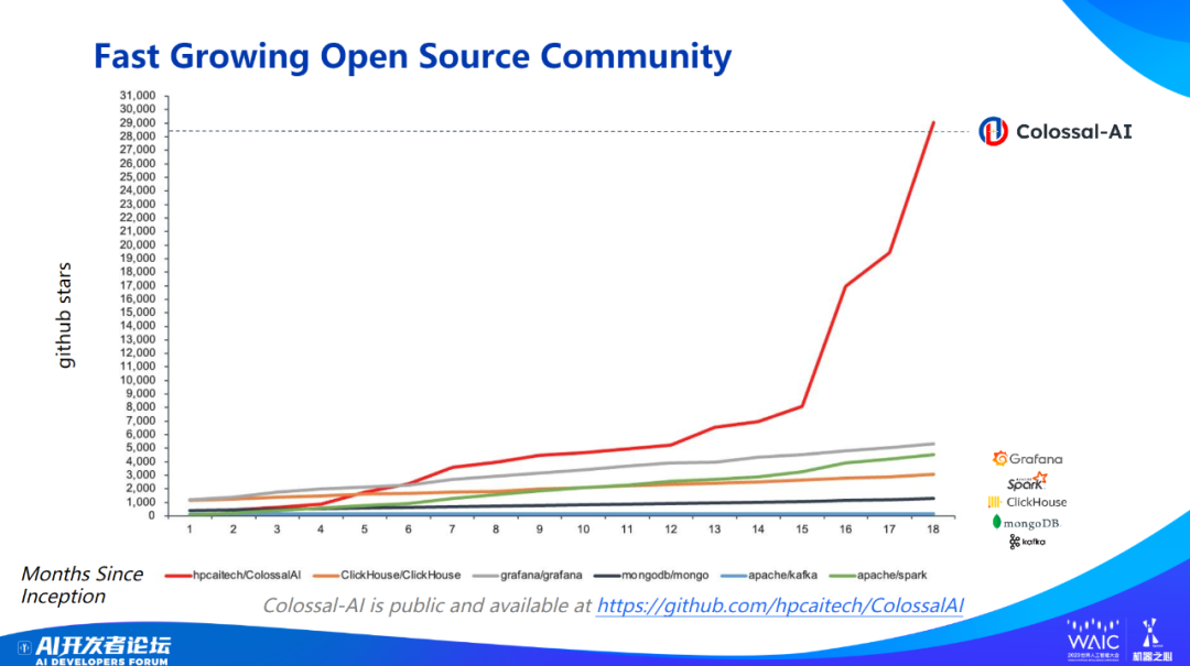 虽然 Colossal-AI 开源社区只推出了 20 个月左右,但发展速度非常快。(下图)横坐标是时间,纵坐标是 GitHub 上的星数,可以看出 Colossal-AI 增长速度远超于传统开源软件。