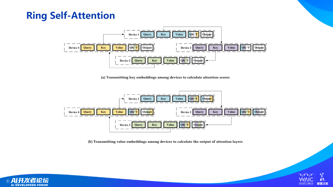 另一个问题是如何减少 GPU 之间的数据移动。100 个 GPU,所有都需要跟其他 GPU 交换数据,这是 Transformer 的 Attention 机制决定的。我们打造了环状 self-attention 通信算法,尽量减少数据之间移动,每次循环只需要跟左右邻居打交道,把通信复杂度从 P 平方降低到 P-1(P,指 GPU 数量或服务器数量)。