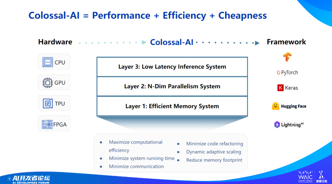 所以,我们打造了 Colossal-AI 系统。这是 Colossal-AI 系统结构图,包括三个层次。