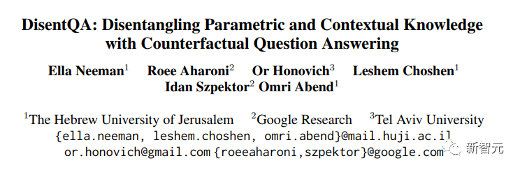 题目:DisentQA: Disentangling Parametric and Contextual Knowledge with Counterfactual Question Answering作者:Ella Neeman, Roee Aharoni, Or Honovich, Leshem Choshen, Idan Szpektor and Omri Abend
