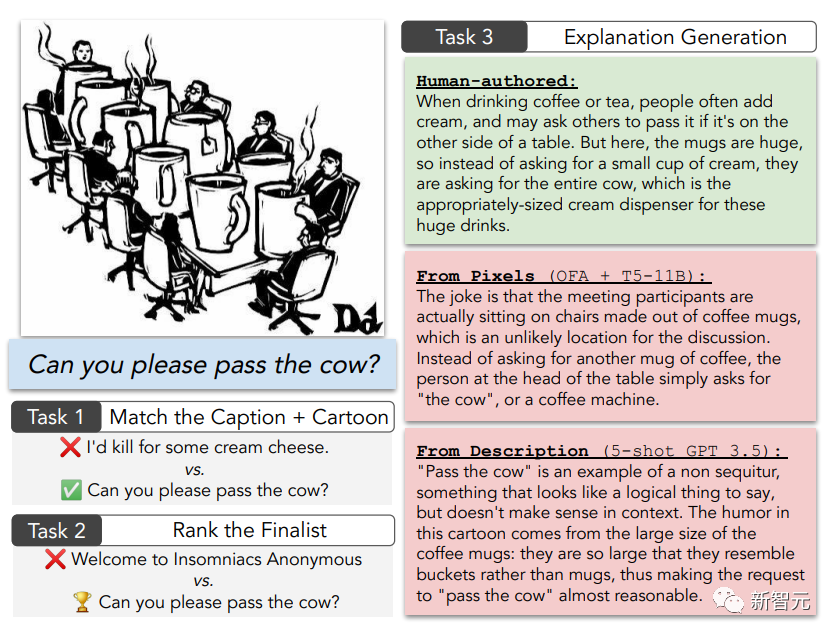 研究人员用《纽约客》漫画标题大赛衍生出的三个任务来挑战AI模型:将笑话与漫画匹配、识别获奖标题,以及解释获奖标题为何有趣。