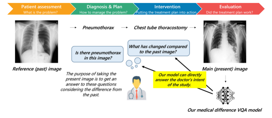 该研究同时提出了一个全新任务,图像对比 VQA (difference VQA):给定两张图片,回答关于这两张图片差异性的问题。在医学领域,这个任务直接反映了放射科医生的需求。在临床实践中,如图 1 所示,医生经常需要对比回看病人之前的医学影像,评估病灶变化情况并以评价诊疗过程。因此 Difference VQA 提出的问题包括” 这张图片与过去的图片相比有什么变化?”, “疾病的严重程度是否有减轻?”