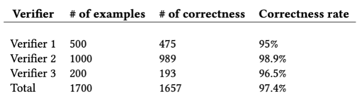 为了进一步保证生成数据集的质量,该研究使用三个人工验证者随机对总计 1700 个考题和答案进行了人工验证,如表 2 所示,最终的平均正确率达到了 97.4%。