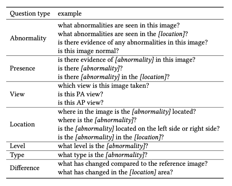 然而,尽管 X 胸片检查报告中包含大量临床信息,现有医学 VQA 任务的问题种类和数量有限,在临床方面的贡献也相对有限。例如,ImageCLEF-VQA-Med 对于胸部 X 光片模态只有两种问题,“这张图片里是否有异常?”,以及 “这张图片里最主要的异常是什么?”,VQA-RAD 的问题种类虽然更丰富,但是却只含有 315 张图片。