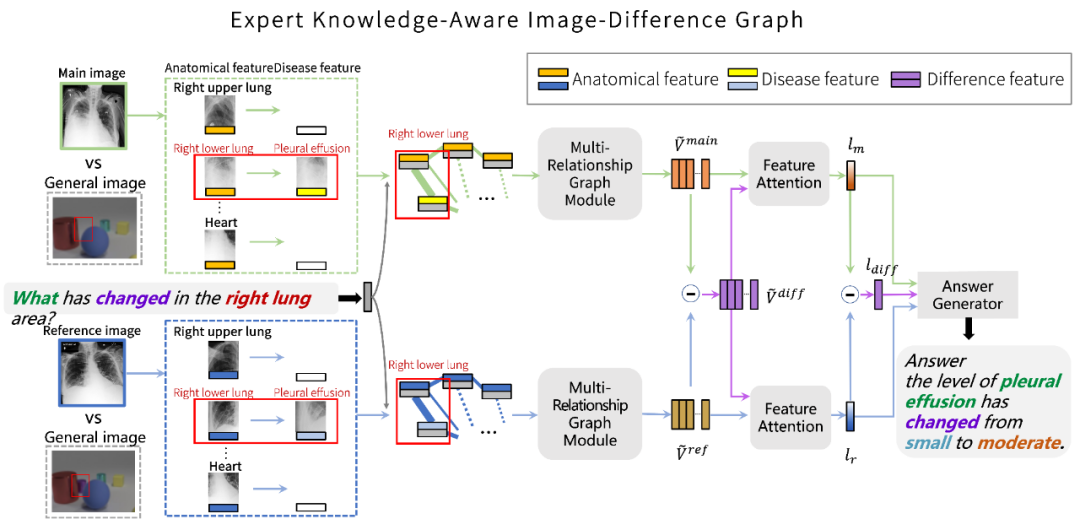 该研究提出了一个医学 Difference VQA 问题,并收集了一个大规模的 MIMIC-Diff-VQA 数据集,以此希望能对推动学界相关技术的发展,同时为医学界提供有力的支持,包括提供临床决策辅助和患者教育工具等方面。同时,该研究设计了一个专家知识感知的多关系图网络模型来解决这个问题,为学界提供了一个基准模型作为参照。与当前在相关领域最先进的方法的比较表明,该研究所提方法取得了显著改进。