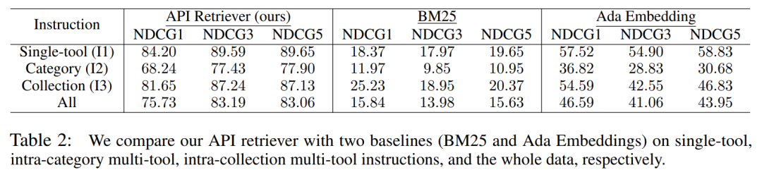 如表 2 所示,在不同类型的指令中,研究团队的 API 检索器始终优于 BM25 和 Ada Embedding。较高的 NDCG 得分表明其在 API 检索方面的有效性。此外,I1 的 NDCG 分数远高于 I2 和 I3,这意味着单工具指令在 API 检索方面比多工具指令相对简单。