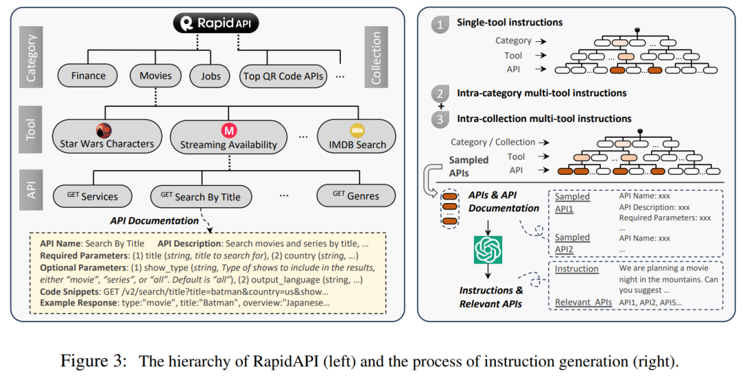 RapidAPI 的层级结构 (左) 和指令生成过程 (右) 如下图所示。对于每个工具,研究者会爬取以下信息:工具的名称和描述,主机的 URL,以及属于该工具的所有可用 API;对于每个 API,研究者会记录其名称、描述、HTTP 方法、必要参数、可选参数、可执行的 API 调用代码片段等。