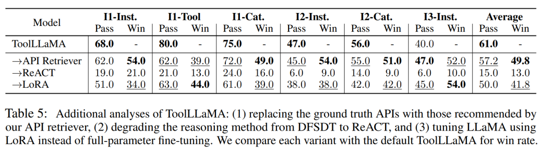 在实验研究团队对 LLaMA 的所有参数进行了微调,得到了 ToolLLaMA。为了提高参数效率,他们进一步应用了具有代表性的参数效率调整方法 LoRA,并研究了其对性能的影响。下表 5 中的结果表明,参数效率的提高是在性能权衡的基础上实现的。他们期待未来的尝试能设计出不牺牲性能的前提下实现参数效率的方法。