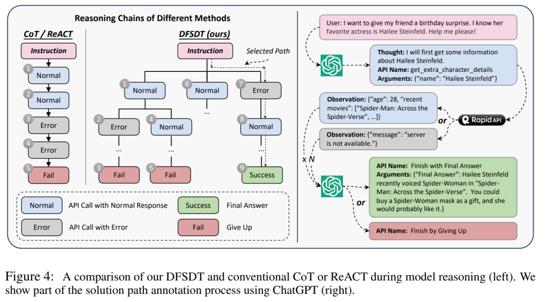下图为在模型推理过程中,DFSDT 与传统的 CoT 或 ReACT 的比较 (左)。