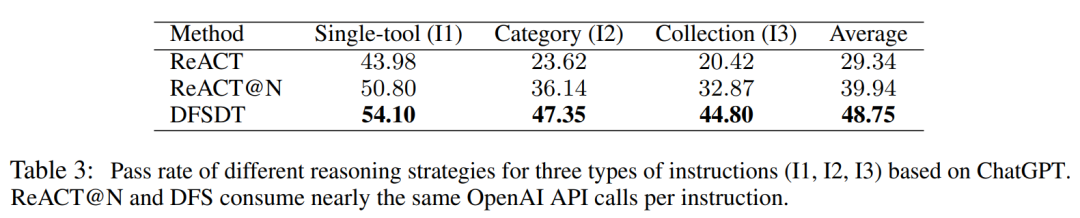 从表 3 可以看出,DFSDT 在所有情况下的性能都明显优于其余两种基线方法,这表明 DFSDT 是一种更有效的方法,可以节省解路径标注的成本。并且与较简单的指令(I1)相比,DFSDT 对较难指令(即 I2 和 I3)的性能提升更为明显。这说明,除了效率之外,DFSDT 还能解决那些困难、复杂的指令,而这些指令是普通 ReACT 无论执行多少次都无法回答的。将此类 「困难示例 」纳入数据集,可以充分激发工具在这些复杂情况下的使用能力。