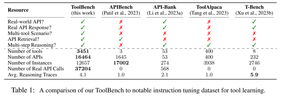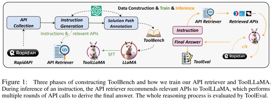 在数据集方面。如图 1 所示,研究者首先收集了一些高质量的指令调优数据集 ToolBench。该数据集是通过使用最新的 ChatGPT(gpt-3.5-turbo-16k)自动构建的。