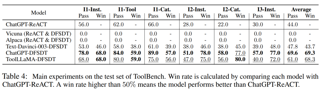 总体而言,ToolLLaMA 在所有场景中都表现出了竞争力,其通过率略低于 ChatGPT+DFSDT。在获胜率方面,ToolLLaMA 与 ChatGPT+DFSDT 的能力基本相当,在 I2-Cat 设置中甚至超过了后者。